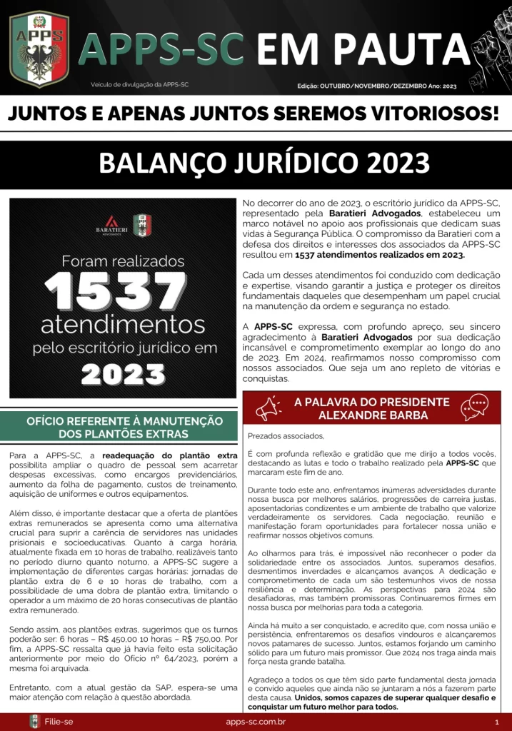 A APPS-SC – Associação dos Policiais Penais e Agentes de Segurança Socioeducativos de Santa Catarina é uma entidade que, desde 2015, luta pela valorização, reconhecimento e defesa dos direitos dos Policiais Penais e Agentes de Segurança Socioeducativos no estado. Nasceu do engajamento da categoria para representar as necessidades específicas dos profissionais, especialmente durante momentos críticos de negociação e mudanças legais que trouxeram avanços para essas carreiras.