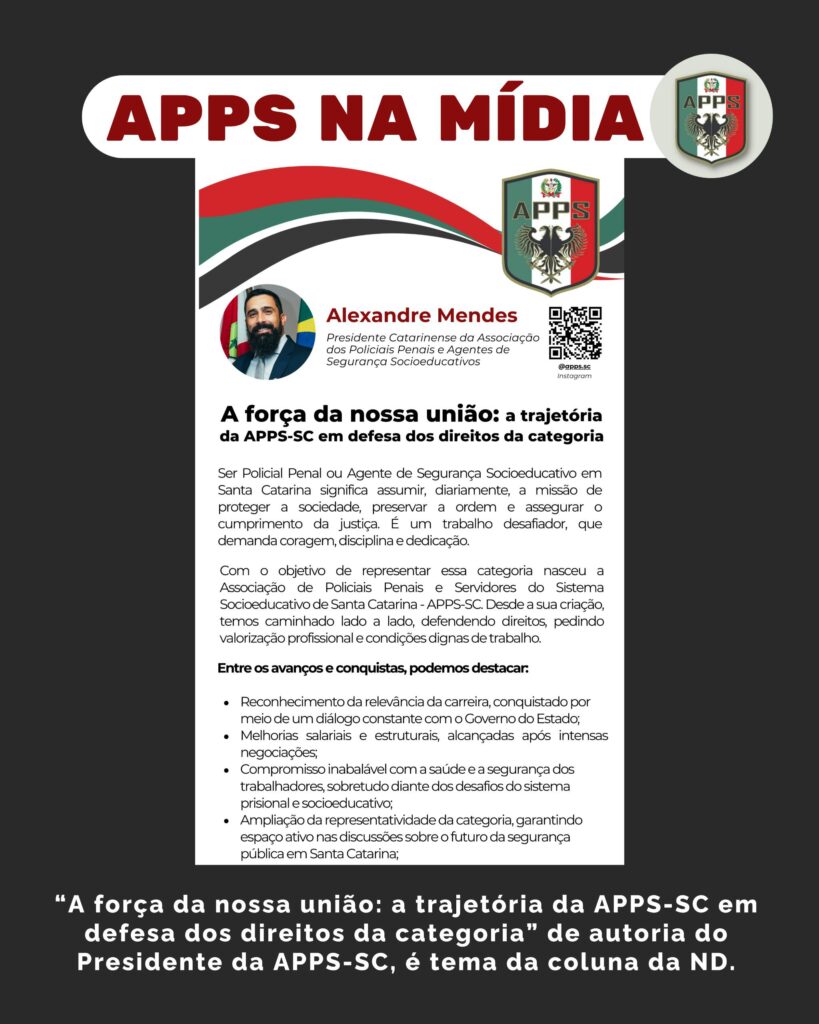 O Presidente da APPS-SC, Alexandre Mendes, é autor do texto publicado na coluna da ND sobre o panorama das principais lutas e conquistas da associação em favor dos Policiais Penais e Agentes de Segurança Socioeducativos de Santa Catarina. A trajetória da APPS-SC é marcada por mobilização, perseverança e compromisso. Ao longo dos anos, a associação […]